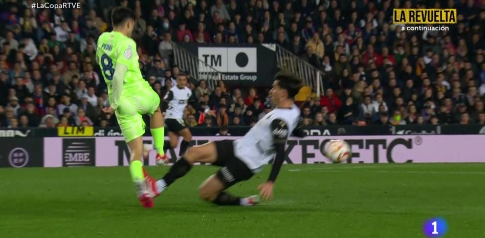 国王杯1/4决赛,巴萨5-0大胜瓦伦西亚,瓦伦球员雨果-吉利亚蒙亮鞋钉飞铲佩德里,佩德里痛苦倒地,但裁判连黄牌都没出。